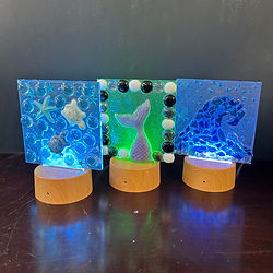 Choose one of these poured resin projects: 1. Framed Resin: Frames are approx 8x10 photo size with actual frames in varying widths. 2. Resin Tray: use a silicone mold to make a 13" oval resin tray. 3. BEACH shelf sitter: use a silicone mold with the word BEACH, OCEAN, or SEA embellish with shells, sharks teeth, beads, sand, plus more to choose. Words are thick enough to stand proudly on your shelf. 4. custom 5"x5" night light with remote & USB cable. Feel free to bring your own embellishments to add that personal tough (examples: shark teeth, buttons, costume jewelry, any small treasure will work) We have examples & ideas for inspiration, Jenny will guide you in this beginner friendly workshop. Each project take approx 60-90minute to complete. Aprons & gloves are provided. Your p art needs to stay at the studio overnight to cure. Price includes all materials and instruction. Check our our photo gallery, Facebook or Instagram for inspiration